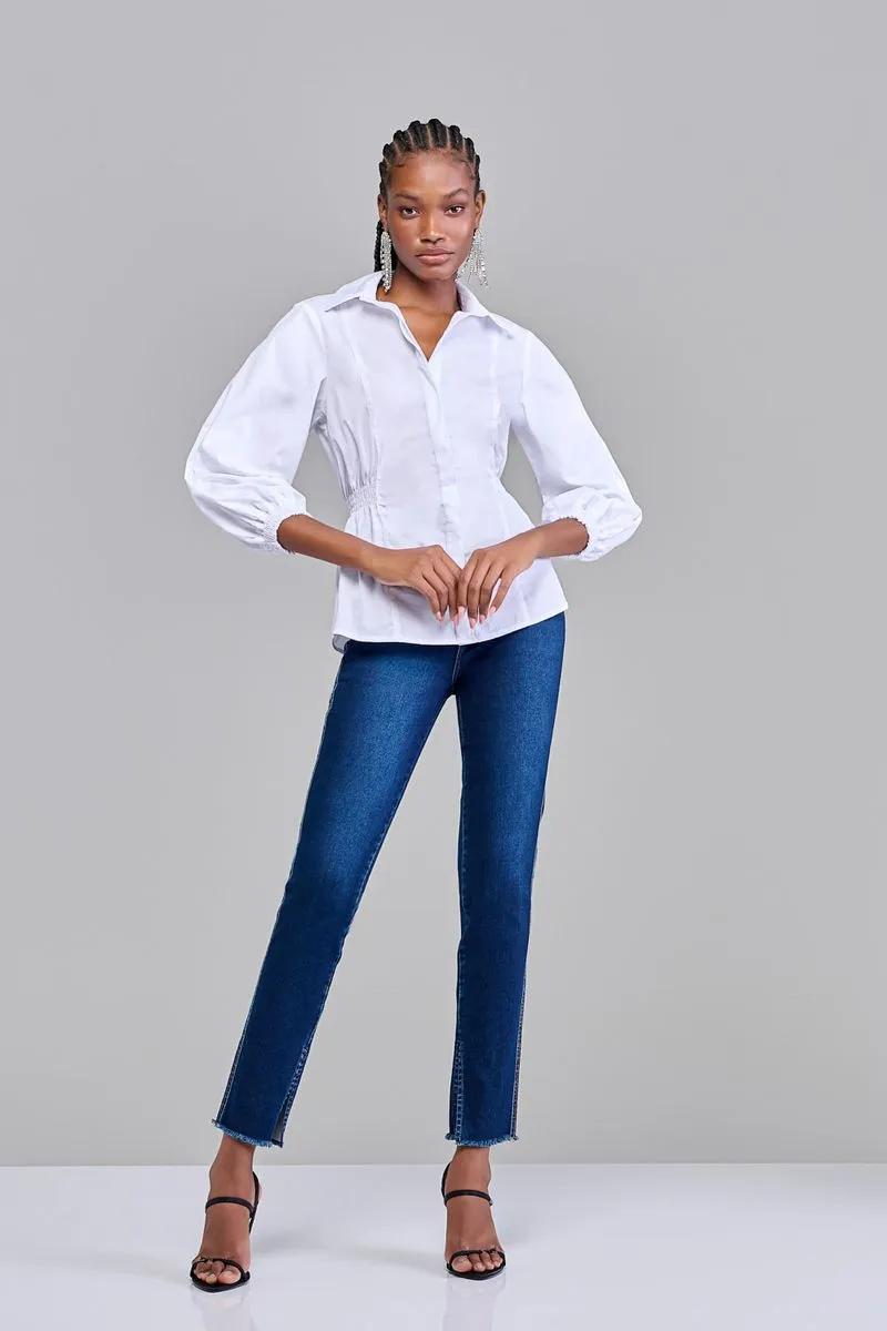 Calça Patogê feminina skinny cintura super alta (G5) em jeans de algodão com elastano e poliéster, proporcionando conforto durante o uso. Detalhe pesponto duplo na lateral, fendas internas, barra a fio, bolsos posteriores, cós com passantes e fechamento frontal por zíper e botão. Lavanderia escura com marcação de costura.