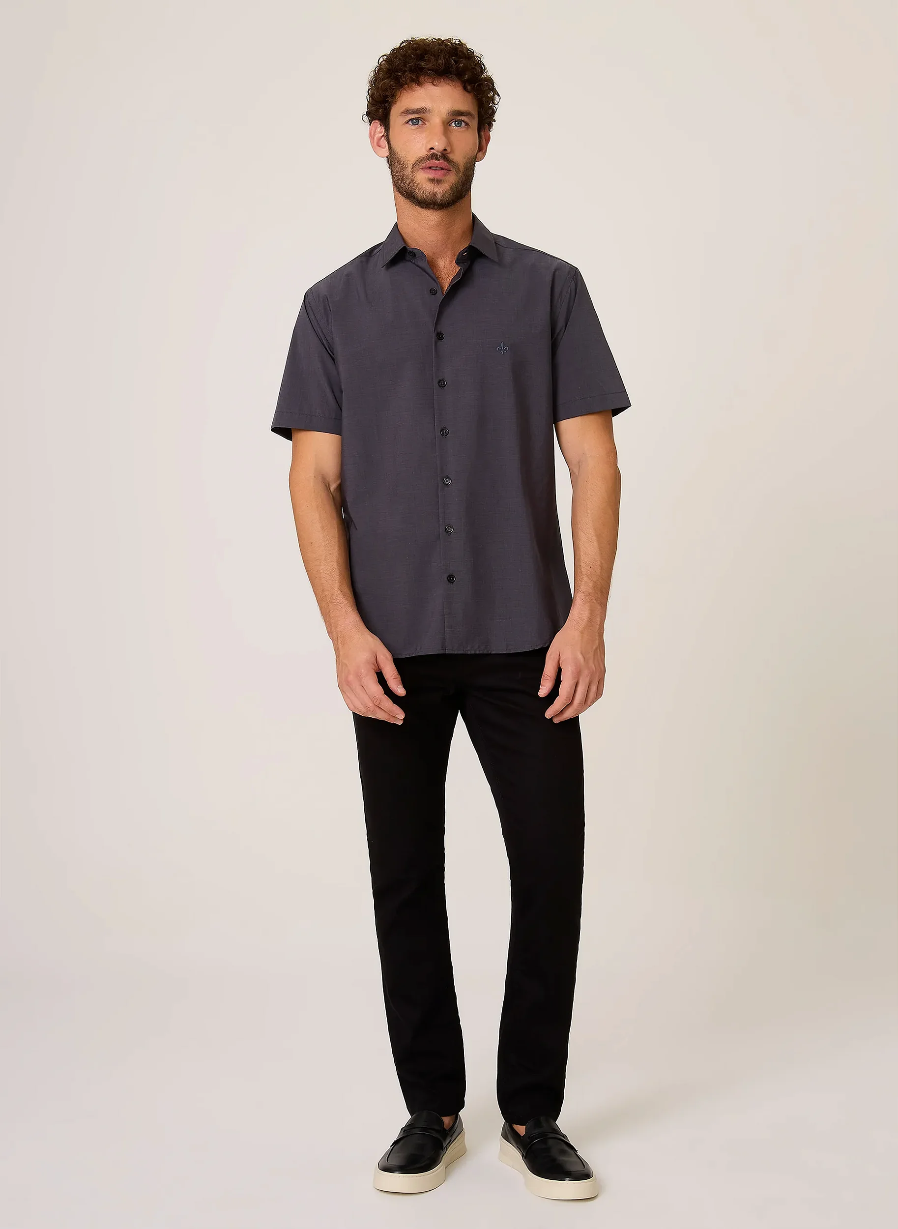 A Camisa é confeccionada em tecido plano com tecnologia Wrinkle Free, possui modelagem Slim, colarinho Slim, mangas curtas, fechamento frontal por botões, detalhe de logo bordada e acabamento pespontado.