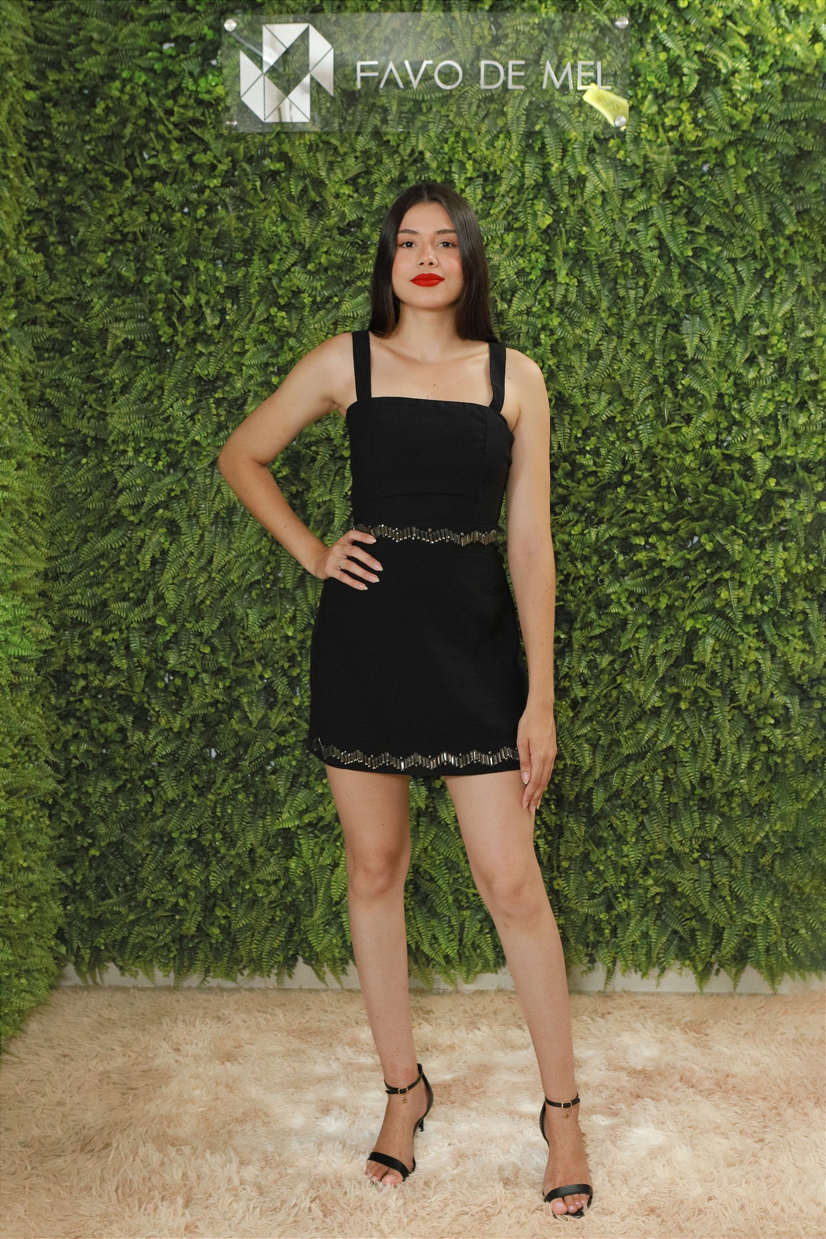 Este é um vestido preto curto com um design elegante e charmoso. Ele possui alças largas e um decote reto, conferindo um toque sofisticado e estruturado à peça. A cintura é bem marcada, destacada por um detalhe em aplicação metálica, que também aparece na barra do vestido, criando um acabamento diferenciado e refinado. O corte ajustado valoriza a silhueta, tornando-o ideal para ocasiões noturnas, jantares ou festas. Pode ser combinado com sandálias de salto e acessórios minimalistas para um look moderno e sofisticado.